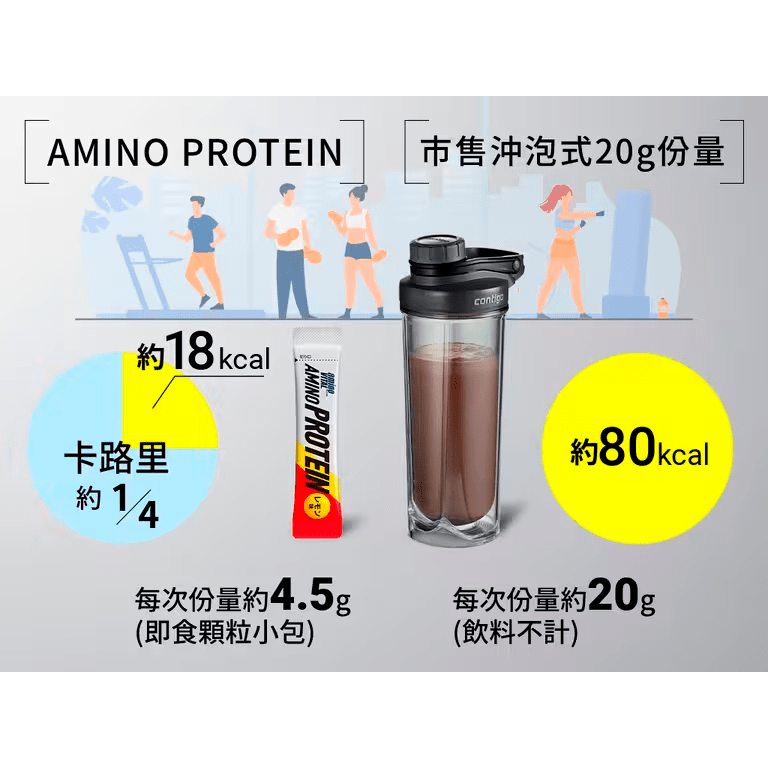 日本味之素高品質專業技術,以必需胺基酸加上乳清蛋白的最佳比例研發。每次只需攝取1包(約4.5g)=市售乳清蛋白商品(約20g),即可發揮效果。條狀小包裝攜帶方便,入口速溶開封即食,不需額外準備水壺、省去等待溶解沖泡時間,輕鬆攝取低負擔,助您掌握最佳補給時機。